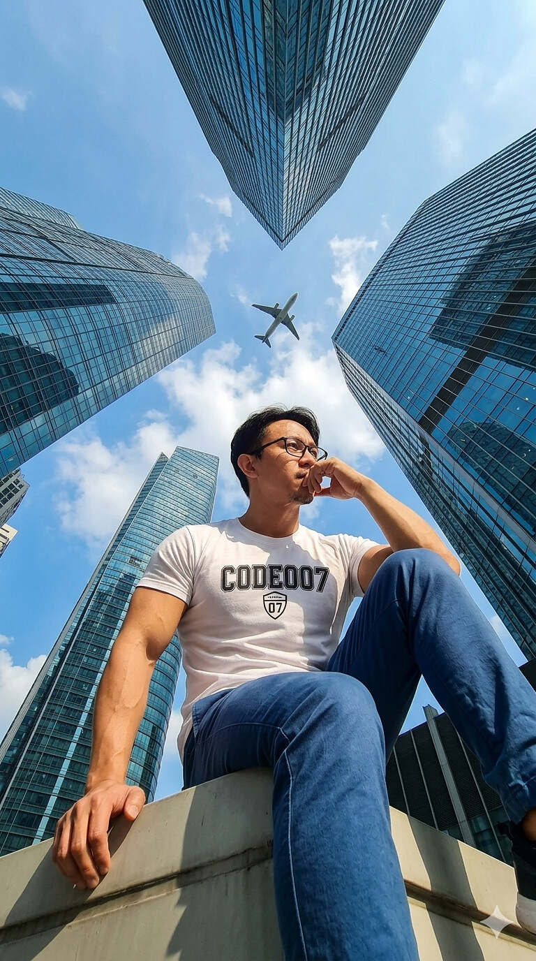 Ultra-realistic wide-angle low-angle shot of a man sitting on a ledge, one leg bent up and the other down, one hand resting on knee near face in a thoughtful pose, other hand gripping the edge. Use blue long pant and white T-shirt with CODE007 as a label. Camera placed below pointing upward, surrounded by tall glass skyscrapers converging toward the sky, airplane flying overhead, blue sky, strong perspective distortion, cinematic lighting, sharp details, 9:16. 100% use my upload reference image image generate